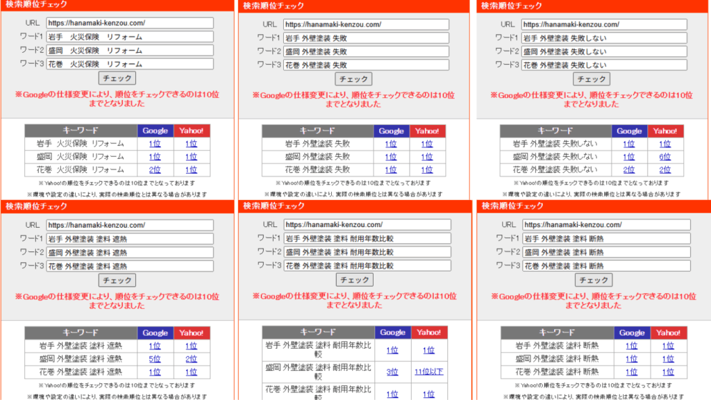| SEO実績 | 「屋根塗装 盛岡」など主要キーワードで上位表示を多数獲得。 |